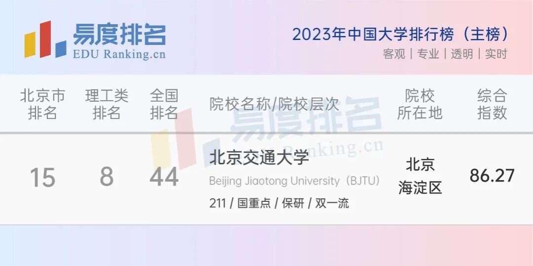 北交大在“2023年中国大学排行榜(主榜)”中的名次,北京的高层次好学校非常多,故而北交大在本地的并不能算顶尖的大学。不过在理工类院校中,该院校首次进入前十行列,在全国排名中也是稳定发挥。