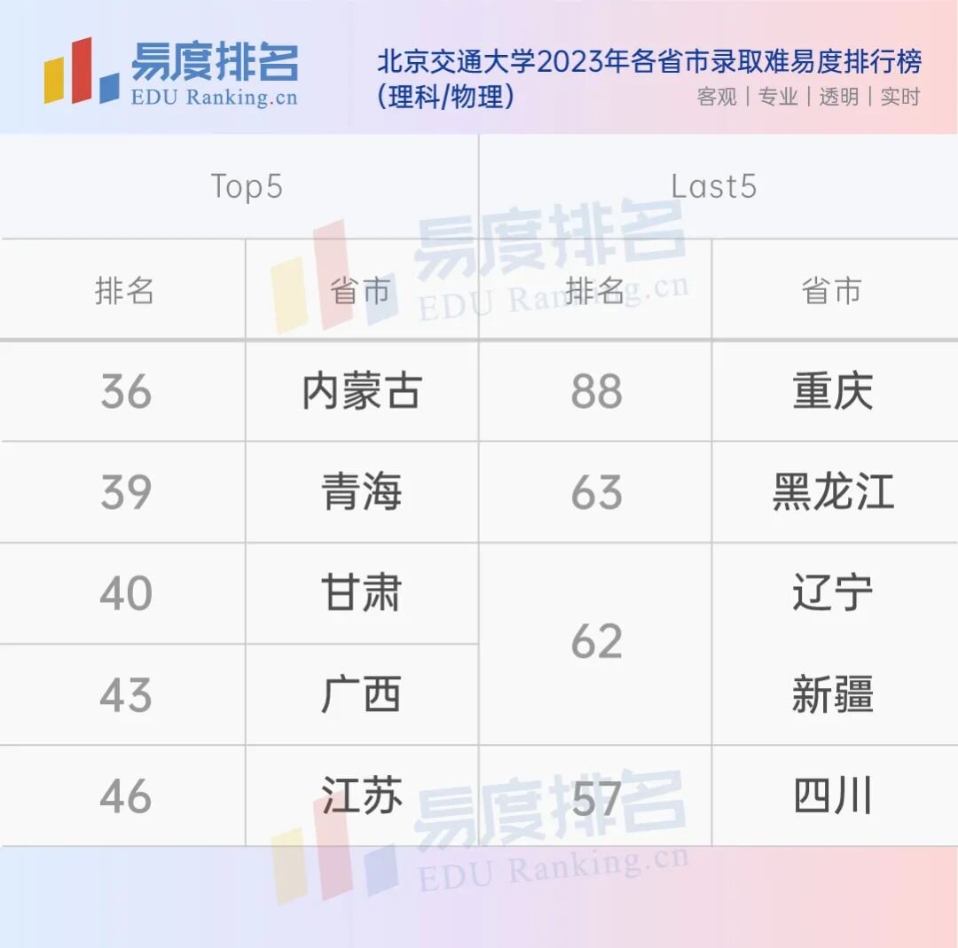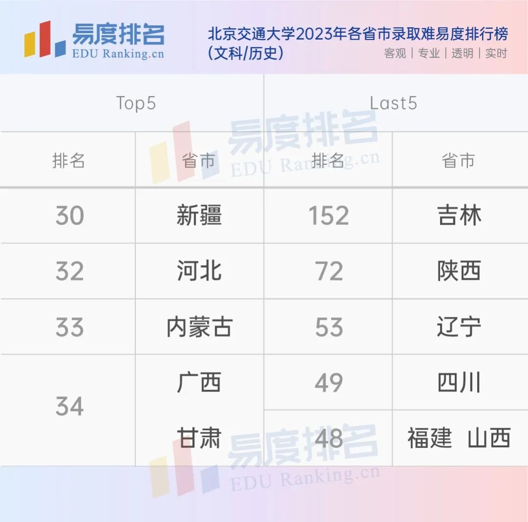 北交大在“2023年各省市录取难易度排行榜”中排名前五和最后五名的省市,内蒙古、甘肃、广西等地在文理方向的报考难度都很大,吉林文科方向是本次榜单中唯一跌出前百名的,与其它省市拉开了很大的差距。北交大在北京市的录取难易度为38名,难度并不算低。