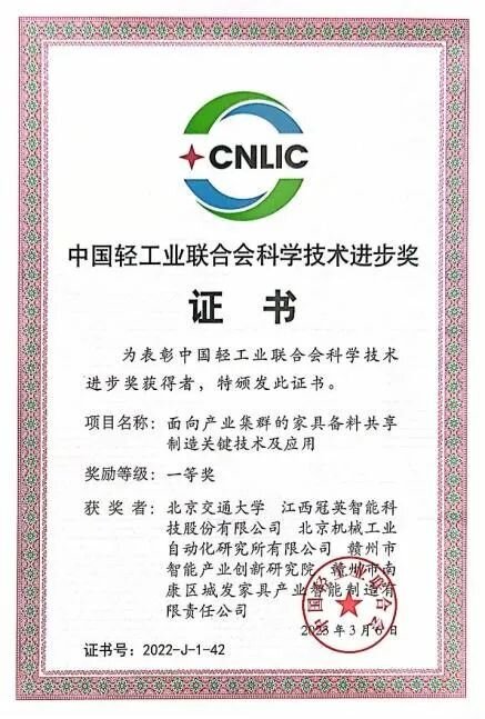 今年4月11日,《2022年度中国轻工联合会科技奖决定》北交大电信学院荆涛教授主持的“面向产业集群的家具备料共享制造关键技术及应用”项目获科学技术进步奖一等奖。这是代表中国轻工行业最高级别的技术奖励,同时也为突破我国家具产业长期处于中低端发展水平的困境提供了重要技术支撑。如今,项目成果已成功应用于江西省赣州市内15家头部企业。