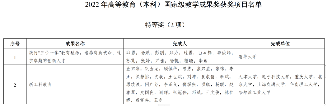 7月24日,教育部印发《关于批准2022年国家级教学成果奖获奖项目的决定》,公布了2022年国家级教学成果奖项目名单。清华大学作为唯一独立单位申报的教学成果《践行“三位一体”教育理念,培养肩负使命、追求卓越的创新人才》获评高等教育(本科)国家级教学成果奖特等奖,这是继2005年之后,清华大学时隔18年再次荣获该奖励。