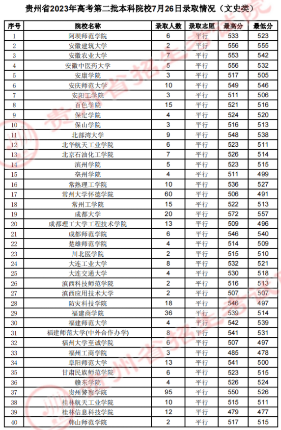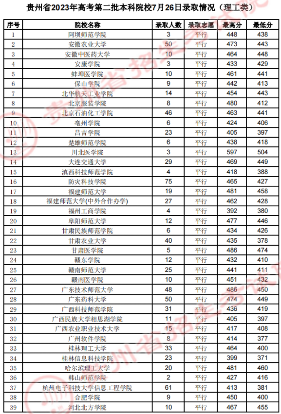 贵州省2023年高考第二批本科院校7月26日录取情况