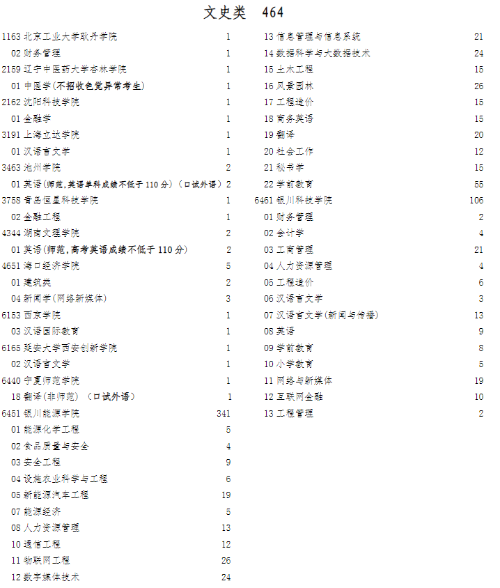 三、征集志愿的院校、专业及名额本次征集志愿文史类有13所院校,464个计划,理工类有11所院校,609个计划(详见附件)。征集志愿所列院校的收费标准、专业要求等以《2023年宁夏报考普通高等学校填报志愿指南》及有关院校《招生章程》为准。