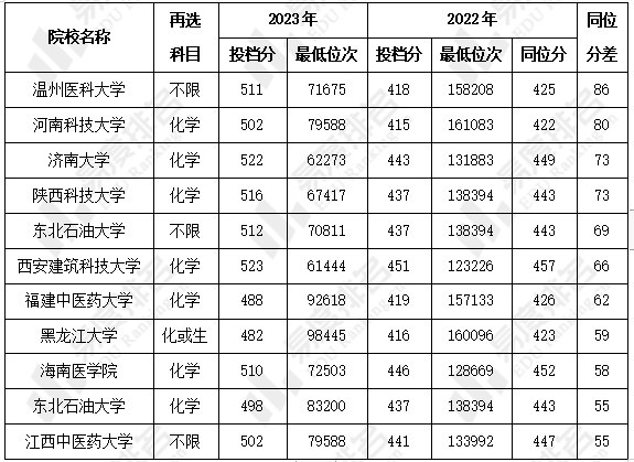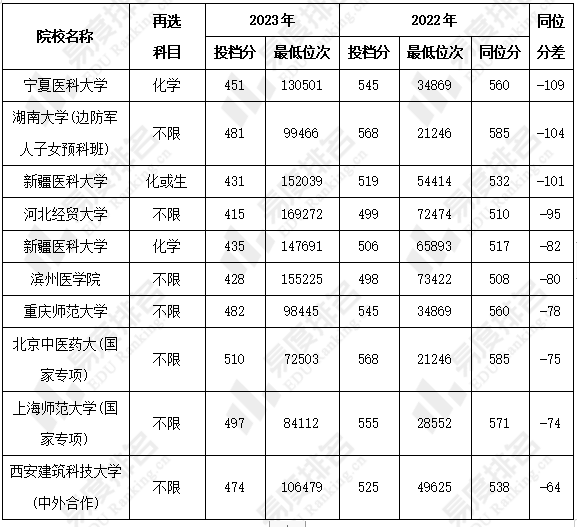 下表展示了投档最低位次下降较多的院校-专业组投档信息,以下含多所医药类大学。2023年