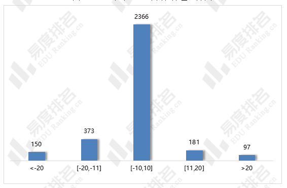 下图展示了湖南2023年物理类普通本科批院校-专业组投档最低分与上一年度同位分差值的直方图,差值为负代表院校-专业组2023年的投档位次有所下降,反之则代表院校-专业组的投档位次有所上升。可以看出75%的院校-专业组与上一年度的同位分差在10分以内,院校-专业组投档位次下降的多于上升的。