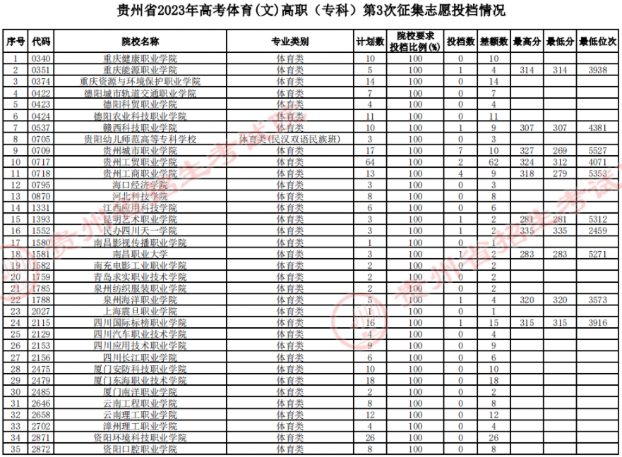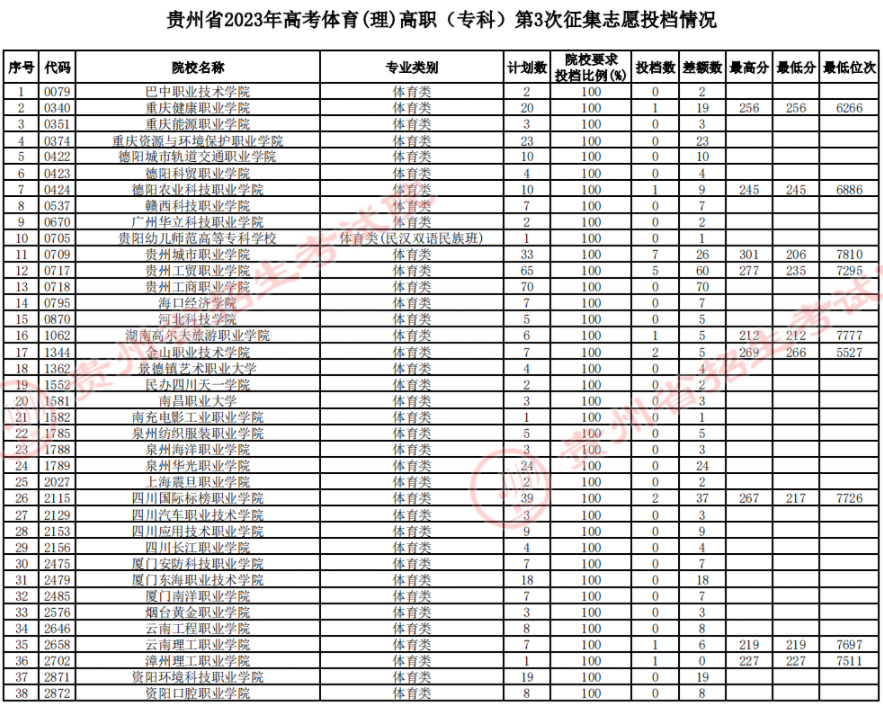 贵州2023高考体育类高职(专科)第3次征集志愿投档情况