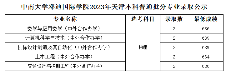 中南大学邓迪国际学院2023年天津本科普通批分专业录取公示