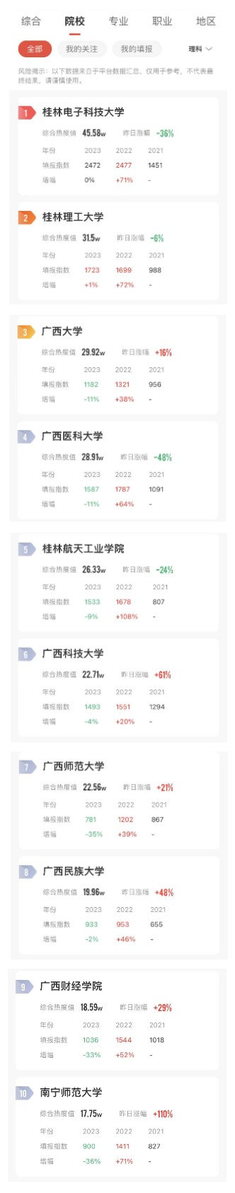 这前十的院校均为广西本地学校,它们分别是:桂林电子科技大学、桂林理工大学、广西大学、广西医科大学、桂林航天工业学院、广西科技大学、广西师范大学、广西民族大学、广西财经学院、南宁师范大学。由此可以看出,大部分广西考生及家长在择校时优先选择本省的院校,这可能与本省院校的招生计划数量较多有关。