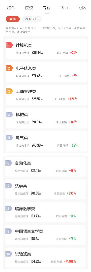 在今年广西高考生报考热度前十的专业中,计算机类专业位居第一,电子信息类、工商管理类专业紧随其后,占据前三位置。其余7个专业分别是机械类、电气类、自动化类、法学类、临床医学类、中国语言文学类、试验班类。