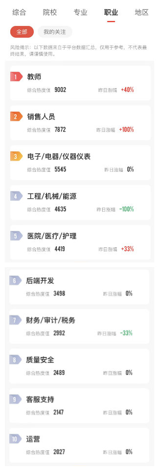 优志愿还整理了广西热度前十的职业,可以看出,教师这一职业的排名依旧稳定第一。其他分别为:销售人员、电子/电器/仪器仪表、工程/机械/能源、医院/医疗/护理、后端开发、财务/审计/税务、质量安全、客服支持、运营。