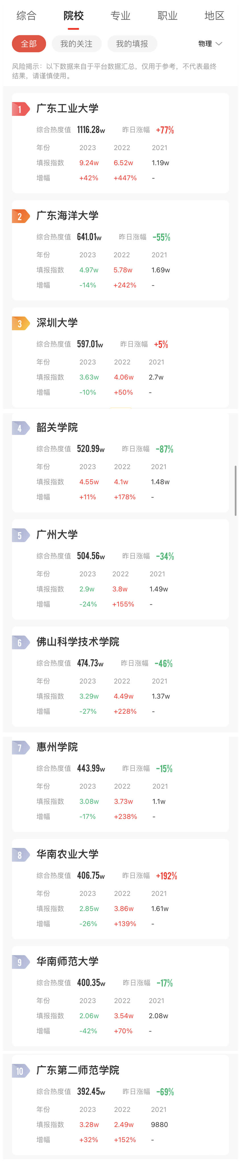 今年的广东省院校报考热度榜中,前十的院校中综合类大学占据半壁江山,然而位居第一的还是广东工业大学这所理工类院校;计算机类专业依旧领跑,电子信息类和工商管理类专业紧随其后;从考生偏好的职业榜来看,“铁饭碗”的教师是众多考生心目中的香饽饽职业……今年广东省高考生报考情况如何?以下为《优志愿2023年高考指数排行榜》详情: