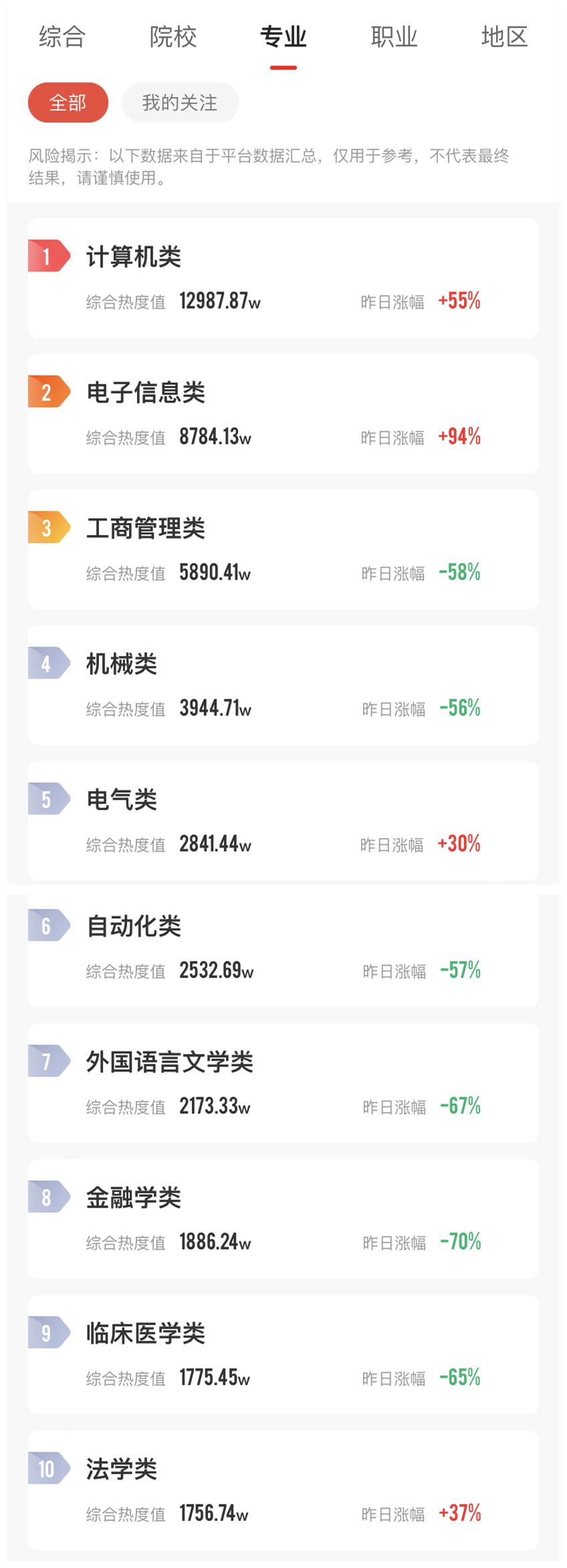 在今年广东省高考生报考热度前十的专业中,计算机类专业位居第一,电子信息类、工商管理类专业紧随其后,占据前三位置。其余7个专业分别是机械类、电气类、自动化类、外国语言文学类、金融学类、临床医学类、法学类。