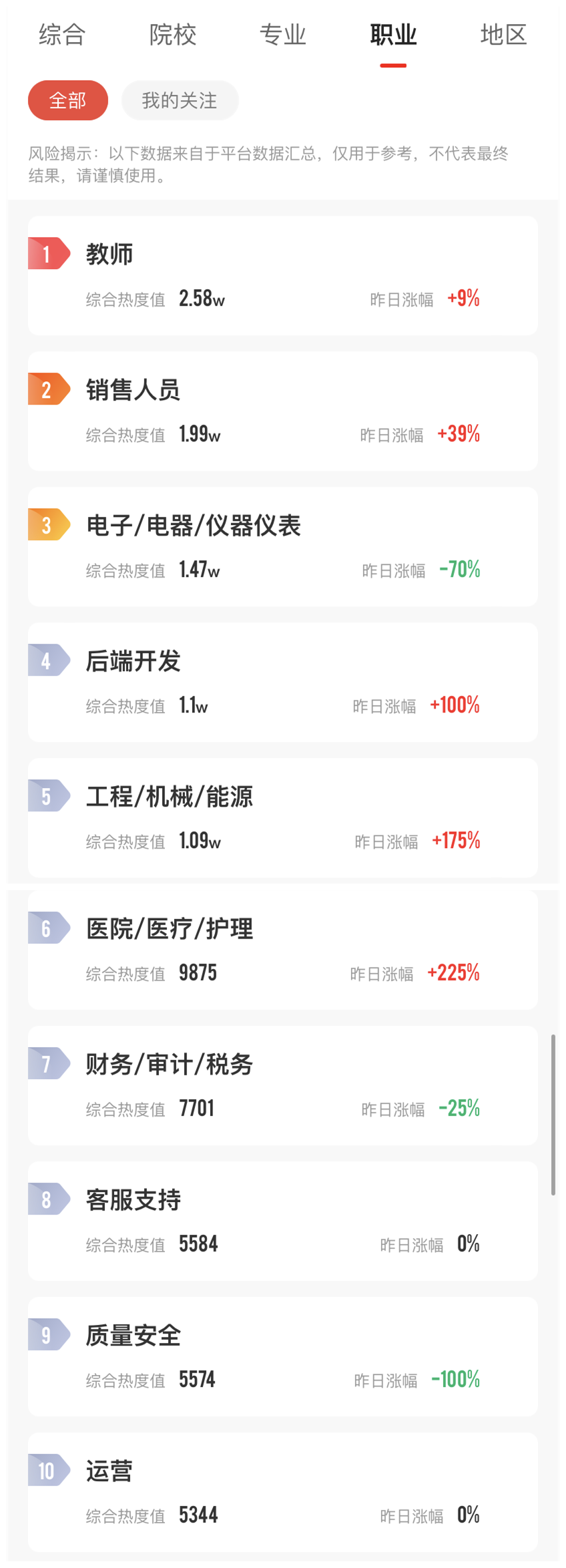 从职业热度榜整体情况来看,广东的考生也同样热衷于稳定的“铁饭碗”职业,比如以绝对优势登顶榜首的教师职业。尤其是在如今就业形势严峻的大环境下,教师以其工作环境稳定、社会地位高待遇好的特点,吸引了越来越多考生的注意。除了教师和医疗行业外,销售、客服、运营这类对于求职人员没有专业门槛的职业也是广东考生比较关注的。