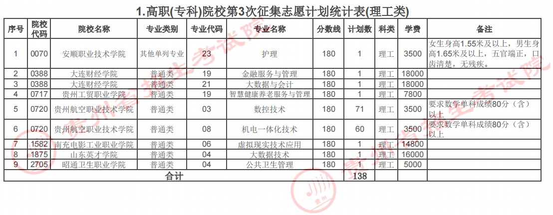 1.高职(专科)院校第3次征集志愿计划统计表(理工类)