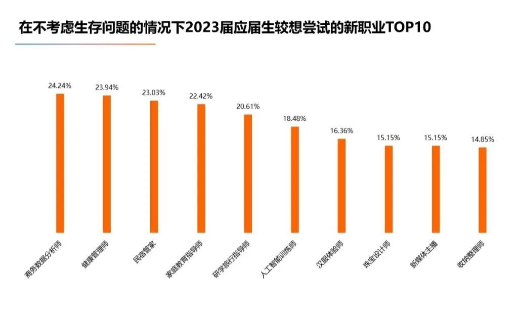 当问及应届生在不考虑生存问题的情况下较想尝试哪些新职业?答复中位居前五的是商务