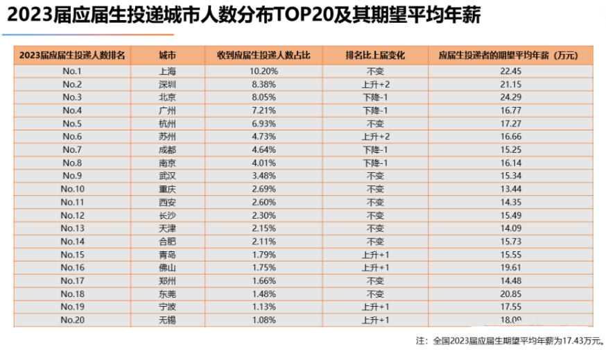 在 2023 届应届生投递的 TOP20 城市中,上海、深圳、北京、广州位居前四,占比为 10.20%、8.38%、8.05%、7.21%。