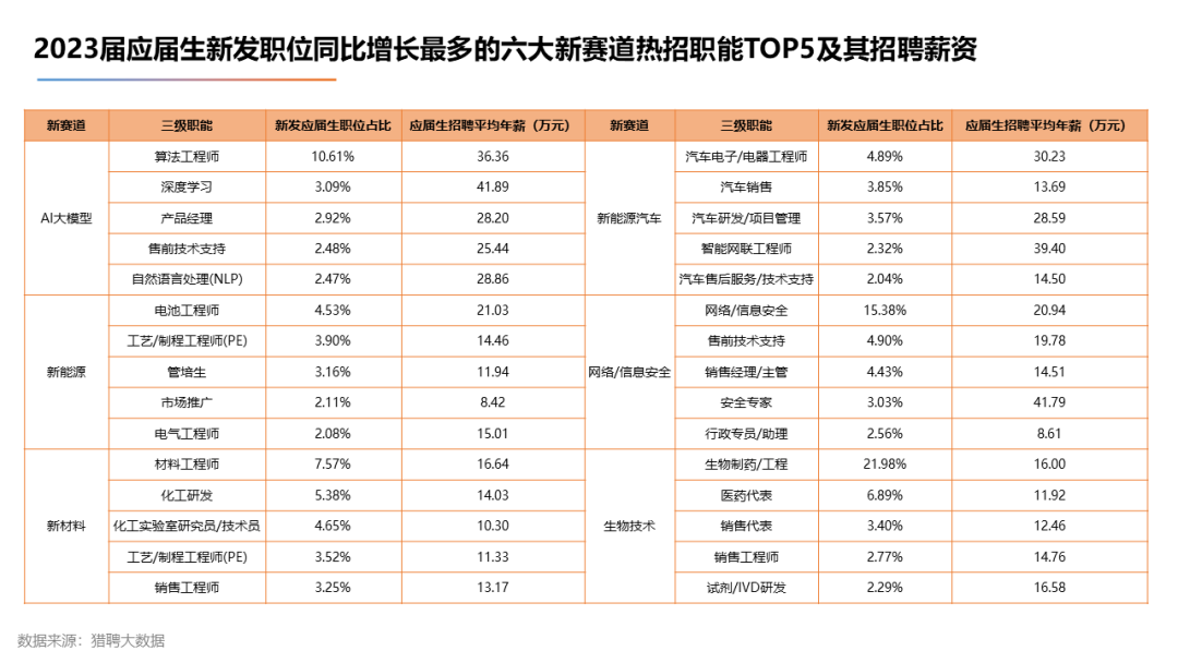 比较应届生职位增长最快的六大新赛道(AI大模型、新能源、新材料、新能源汽车、网络/