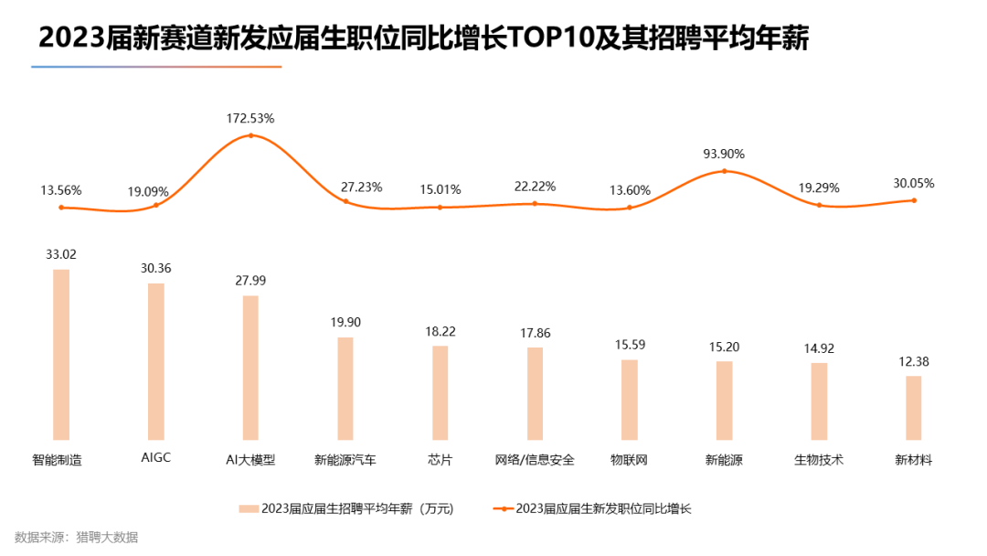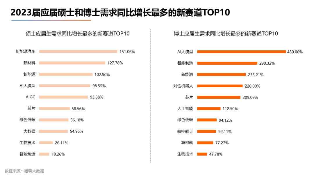 在2023届硕士应届生需求增长最多的TOP10新赛道中,新能源汽车、新材料、新能源包揽前三,同比增长151.06%、127.78%、102.90%;AI大模型和AIGC位居第四、第五,增长率为98.55%、93.88%。