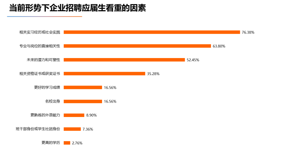 根据调研显示,企业招应届生最重三要素:实习经历/社会实践、专业与岗位的直接相关性、未来的潜力和可塑性;得票率为 76.38%、63.8%、52.45%。相关资格证书或获奖证书位居第四(得票率 35.28%);名校出身、更好的学习成绩并列第五,得票率均为 16.56%。