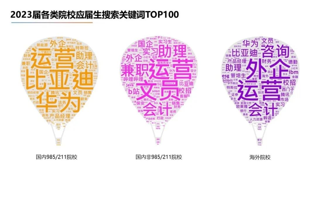 对比2023届国内985/211院校、非985/211院校与海外留学毕业生在搜索关键词TOP100发现,985/211院校和海外留学毕业生侧重搜索具体公司——前者更熟悉国内产业情况,更偏重科技大厂、新能源车企;后者有国际化背景优势,更侧重外企。非985/211毕业生侧重具体岗位。可见,985/211毕业生和海外留学生求职目标更清晰。