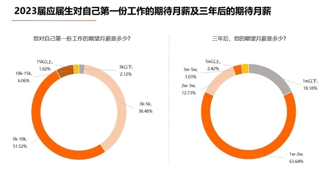 3、超5成应届生首份工作期待月薪5千-1万,超6成期待三年后月薪1万-2万。