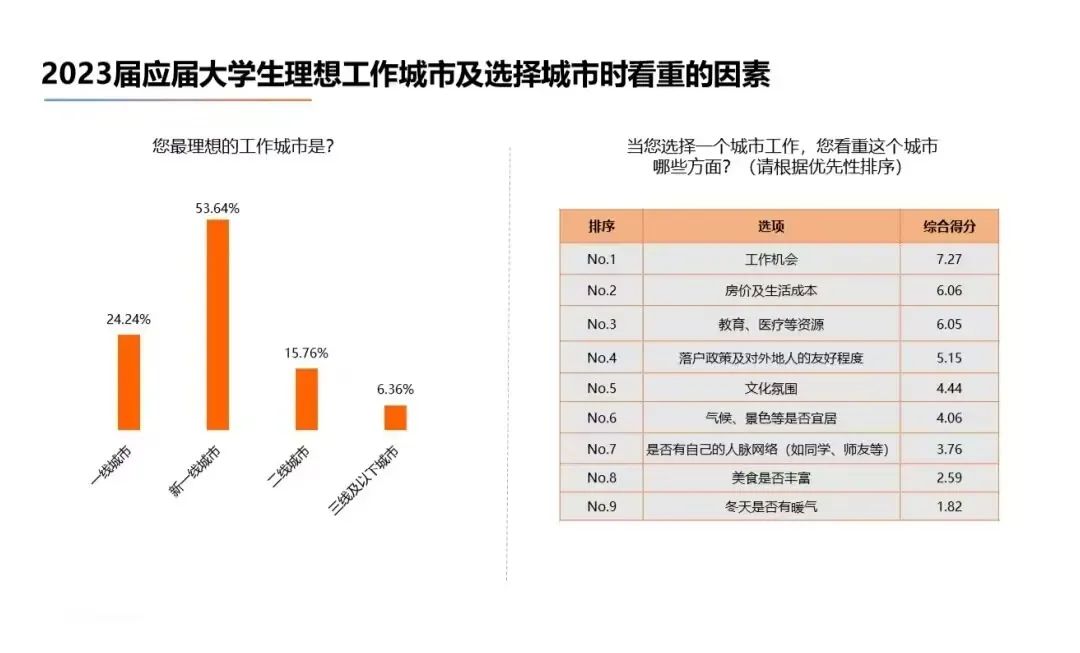 2023届应届生的调研显示,53.64%的应届生表示最理想工作城市是新一线城市,其次是一线城市(占比24.24%)。