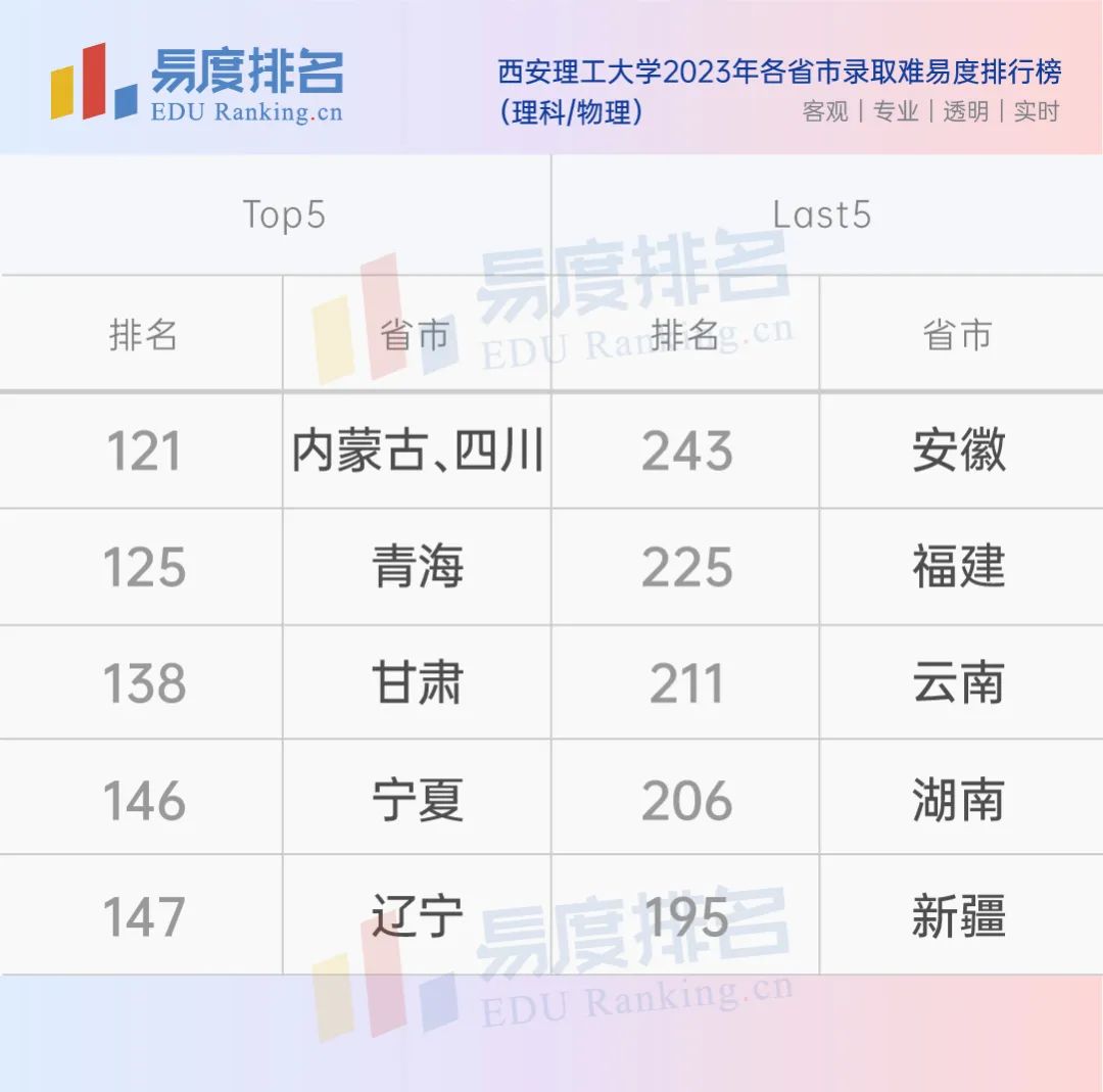 西安理工大学在各省之间的排名有差距,但不至于悬殊,偏远地区如内蒙古、青海、甘肃等地的录取难度更高一些,南方城市的考生报考性价比更高。西安理工大学在陕西省的物理和历史的录取难易度分别为161名和166名,属于中等水平。