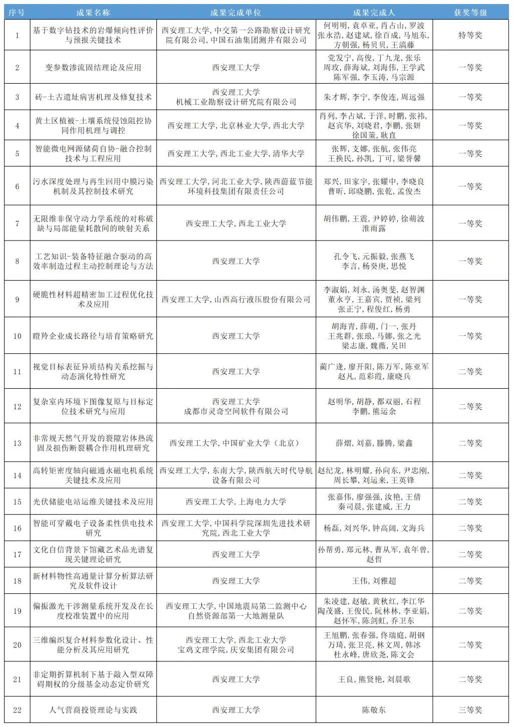 4月,陕西省教育厅印发了《关于表彰2023年度陕西高等学校科学技术研究优秀成果奖的通报》,西安理工大学主持及参与完成的26项科技成果获得奖励,其中特等奖1项、一等奖10项、二等奖14项、三等奖1项。