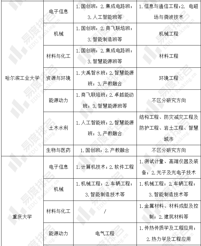 表 2 国家卓越工程师学院与普通学院招生专业研究方向对比(部分高校)
