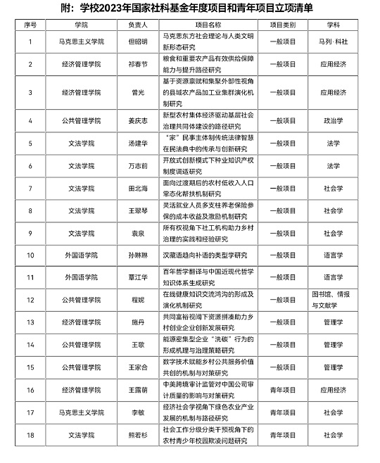 9月22日,全国哲学社会科学工作办公室公布了2023年国家社科基金年度项目和青年项目立项结果。华中农业大学共有18个项目获得立项资助。今年华中农业大学国家社科基金年度立项目中,一般项目15项,青年项目3项。涉及马列·科社,应用经济,政治学,法学,社会学,语言学,图书馆、情报与文献学,管理学等8个学科。