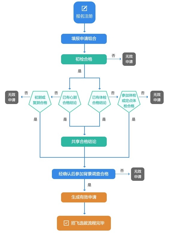 为帮助您在招飞选拔过程中节约时间和费用,便于您更好地备考,同时让您有机会在更多的合格申请组合中选择确认有效招飞申请,系统对部分环节的结论在特定情况下设定了结论共享。请注意,这里的结论共享特指申请组合之间共享。