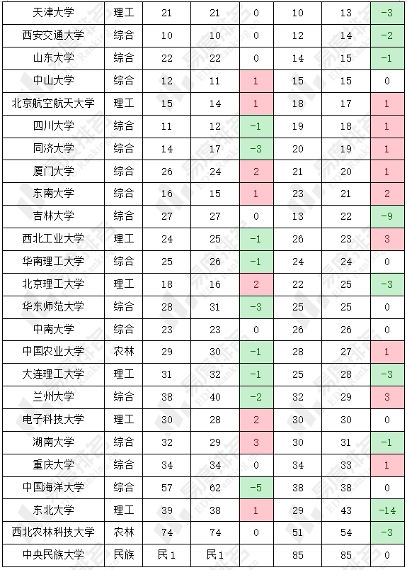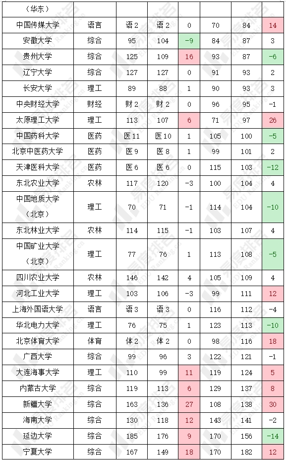 与985院校不同的是,211院校的名次变动更为激烈。两个榜单中,名次靠后且排名波动较大的院校多处于各