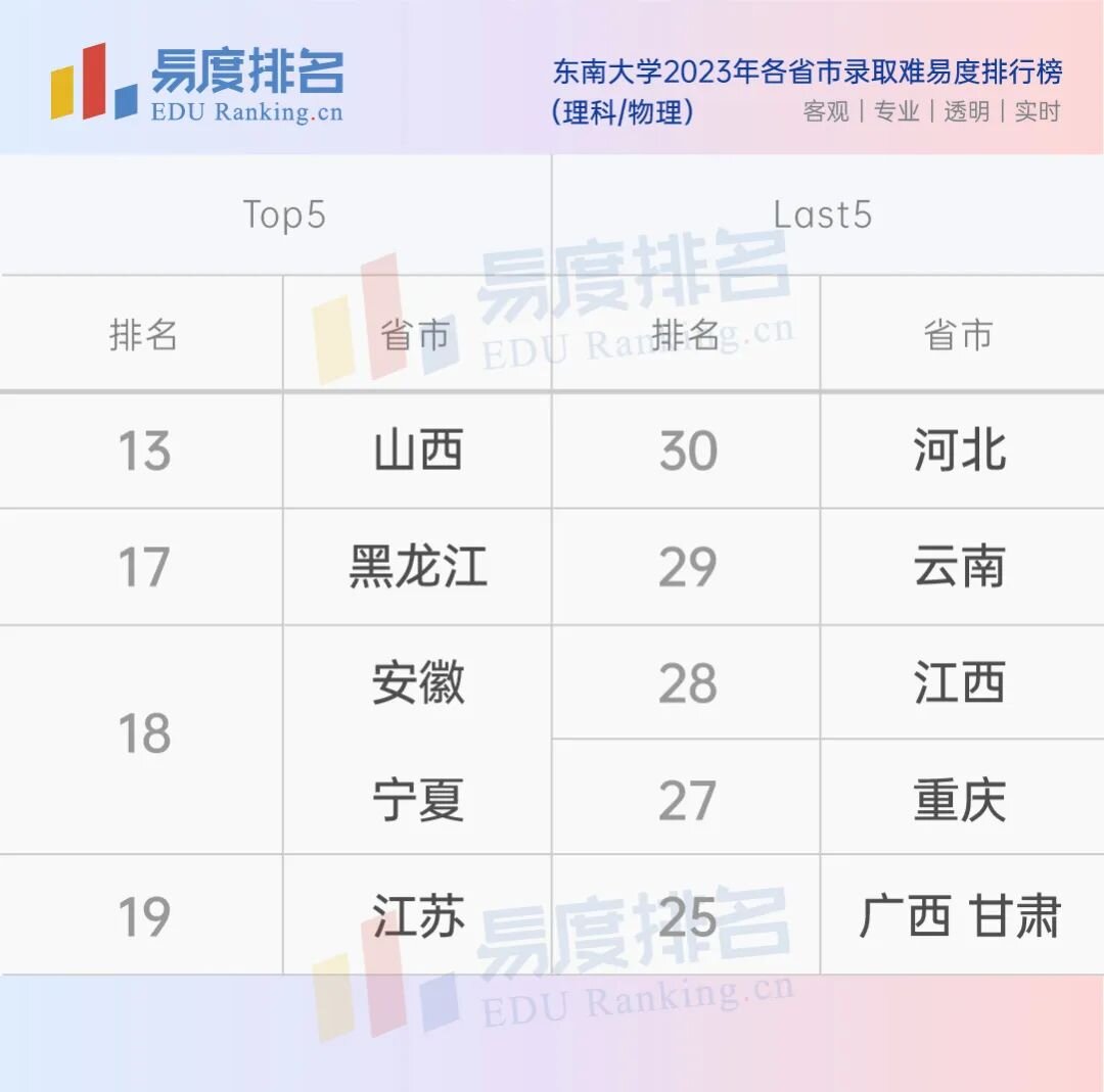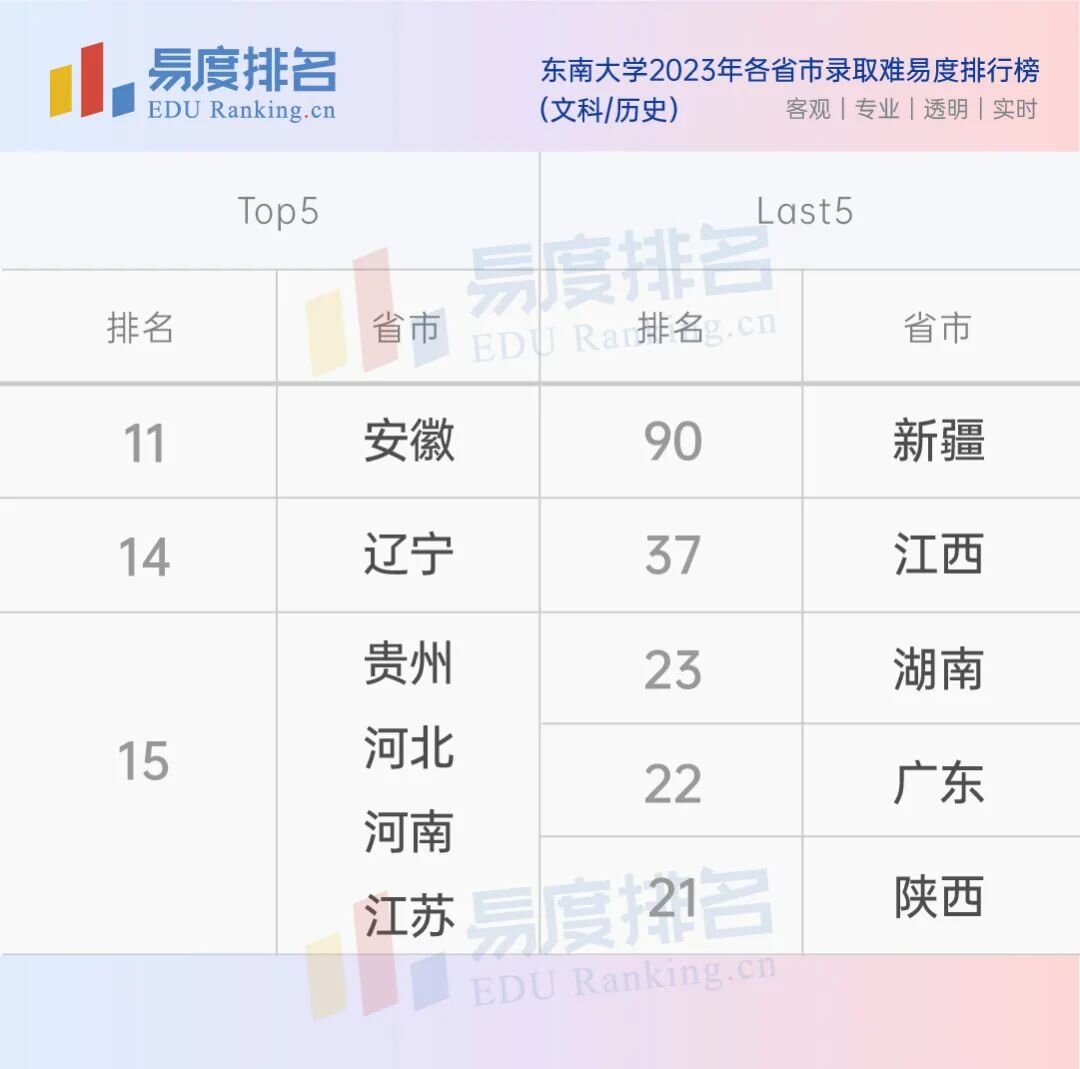 东南大学在各省的排名差距并不大,在部分省市仅招收物理或理科考生,难度都非常高,今年唯有新疆的文科方向遇冷,排到了90名。学校在江苏省的物理和历史方向录取难易度分别为19名和15名。