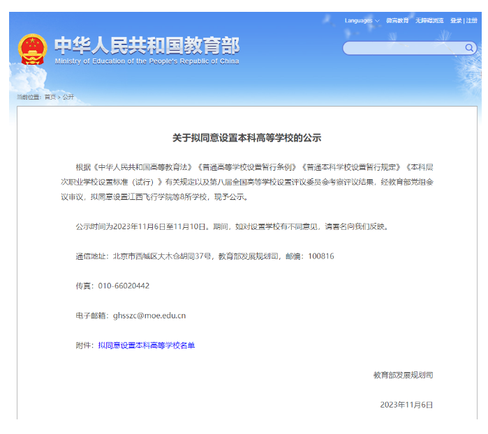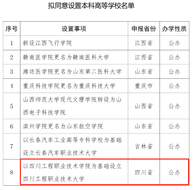 教育部网站6日发布《关于拟同意设置本科高等学校的公示》,拟同意设置江西飞行学院等8所学校。公示时间为2023年11月6日至11月10日。期间,如对设置学校有不同意见,请署名向教育部反映。其中我省一所高校在列,以四川工程职业技术学院为基础设立四川工程职业技术大学。