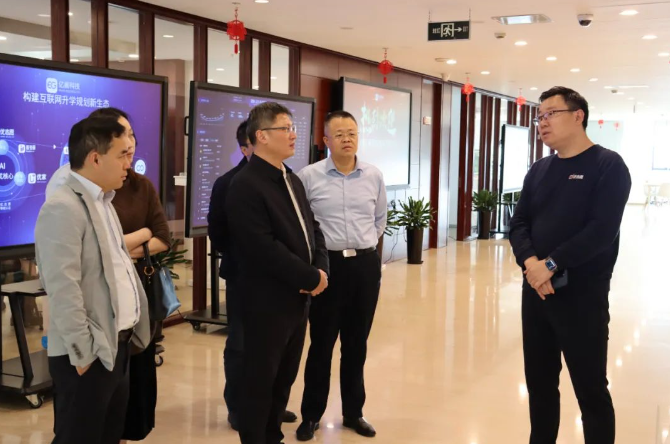在实地参观了亿阁科技的现代化办公空间后,亿阁科技CEO耿忠诚向张部长一行详细介绍了企业的发展历程、核心理念、未来发展方向以及社会责任等方面的工作情况。耿总还从院校、专业、就业、报考热度等多个维度,向张部长一行展示了大数据系统如何助力考生更好地填报志愿。他引用了大量实例,使得张部长对亿阁科技的发展理念和产品特性有了更为深入的了解。