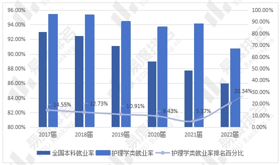 图1.2017-2022届护理学类本科生毕业半年就业率及排名百分比