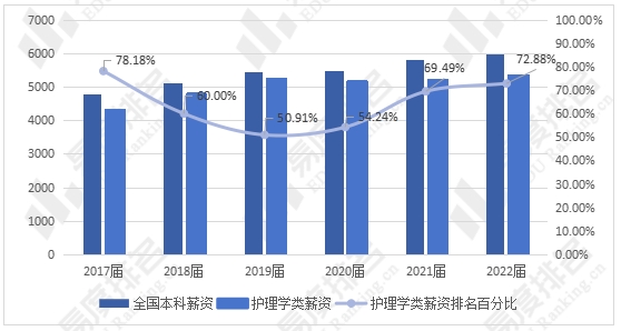 图2.2017-2022届护理学类本科生毕业半年的月薪资(元)及排名百分比