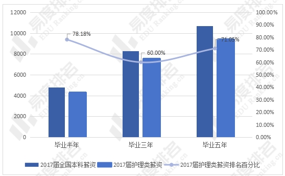 护理学类毕业生毕业5年后的薪资排名百分比虽然有所上升,但其就业薪资始终低于全国毕业生的平均薪资,且与平均薪资间的差额从毕业半年的452元逐渐拉大到五年后的1285元。