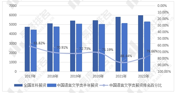 图2.2017-2022年中国语言文学类本科生毕业半年的月薪资(元)及排名百分比