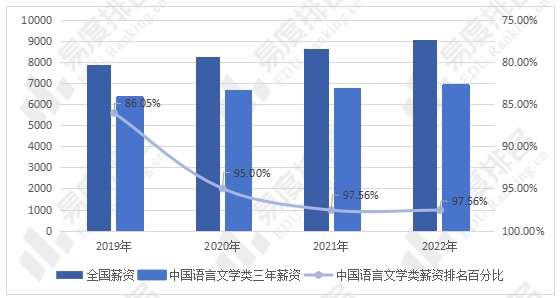 图3.2019-2022年中国语言文学类本科生毕业三年的月薪资(元)及排名百分比