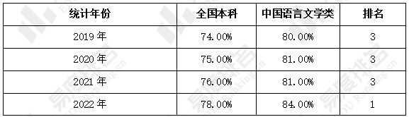 注:1.中国语言文学类就业率排名百分比=中国语言文学类专业就业率排名/已统计就业率的专业类数量 2.为确保数据可靠性,未包含部分样本较少的专业类