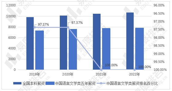 注:1.中国语言文学类薪资排名百分比=中国语言文学类专业薪资排名/已统计就业率的专业类数量 2.为确保数据可靠性,未包含部分样本较少的专业类