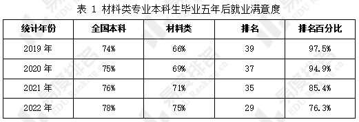 材料类本科生毕业五年后就业满意度在2019年仅为66%,为所有专业类中最低,到2022年就业满意度上升至75%,满意度排名也上升至第29名,与全国本科平均就业满意度差距不断缩小。近年材料相关行业工作环境的不断改善,以及薪资待遇的不断提高,材料类专业就业满意度有了明显提高,尤其是应届毕业生的就业率在大环境整体下行的情况下止跌回升,都说明了材料类专业正在努力摆脱“天坑专业”这一负面标签。