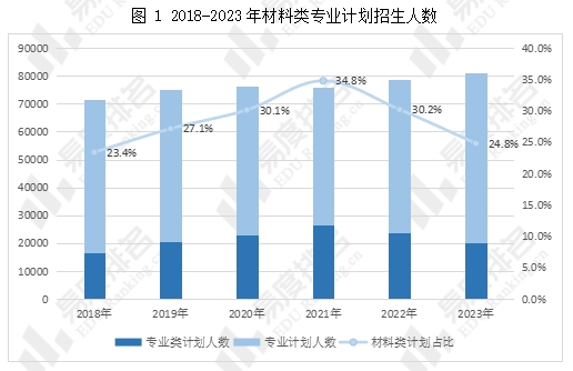 2018年材料类专业计划招生71000余人,到2023年计划招生人数达80000余人,增长幅度为13.3%。材料类专业按专业类招生历年计划人数占比都在23%以上,但这一比值在2021年达到顶峰后开始大幅下降,到2023年按专业类招生的计划人数占比已低于25%。