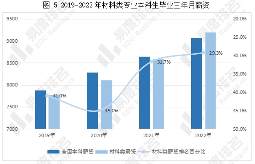 2022年全国本科生毕业三年后月薪资为9074元,较2019年上涨15%。材料类专业毕业三年后月薪资在2019年还低于全国平均水平,到2022年超过全国平均水平达到9196元,涨幅达到18%,薪资排名也从第16名上升至第12名。