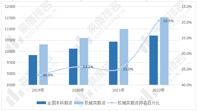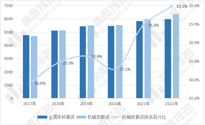 机械类专业毕业五年后月薪资历年均高于全国本科平均水平,并且薪资差距逐渐拉大,到2022年机械类专业毕业五年后月薪资高出全国平均水平820元,薪资排名从2019年的第14名上升至2022年的第8名。