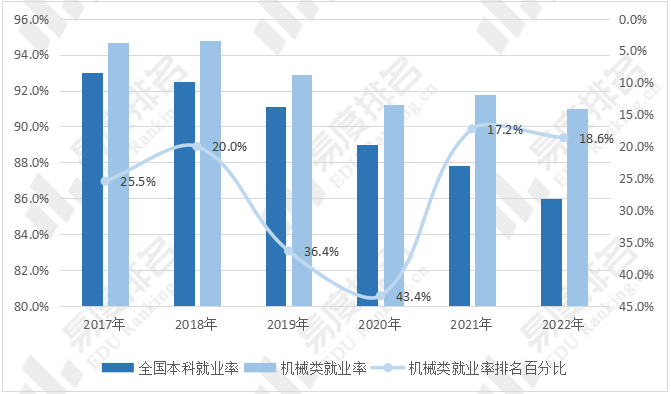 图 3 2017-2022年机械类专业本科生毕业半年就业率
