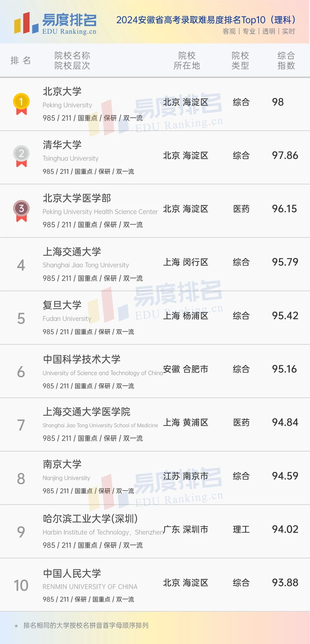 “2024安徽省高考录取难易度排名(理科)”的对象是中国1098所本科级院校。为合理展示各大学的排名,易度将其从院校性质和类型上划分为综合性大学和12类单科性大学。