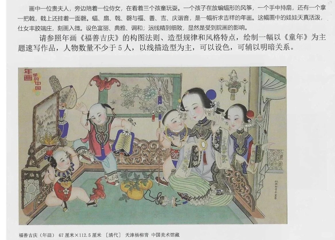 速写题目: 根据图像按要求完成命题创作考试题目:请参照年画《福善吉庆》的构图法则、造型规律和风格特点,绘制一幅以《童年》为主题速写作品,人物数量不少于5人,以线描造型为主,可以设色,可辅以明暗关系。考试时间: (2小时)120分钟