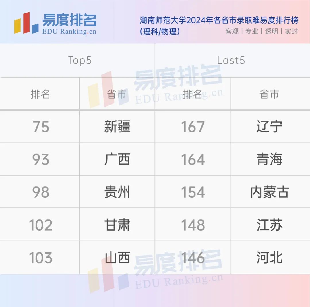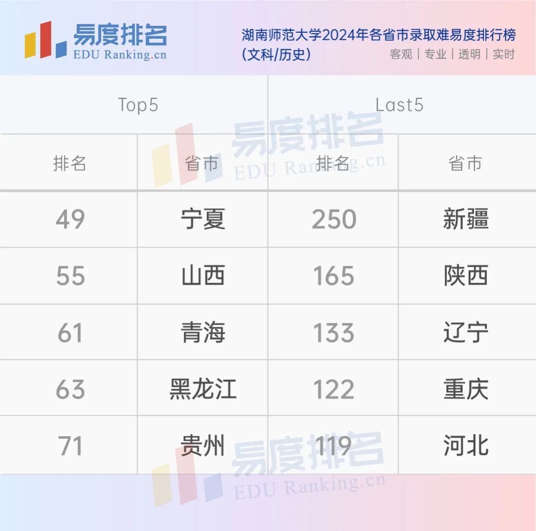 湖南师大在青海、贵州、山西等地的报考难度更大,新疆文科排名是唯一跌出200名的,辽宁、河北考生报考性价比更高,学校在湖南省的物理和历史方向录取难易度分别为128名和102名,属于中等水平。
