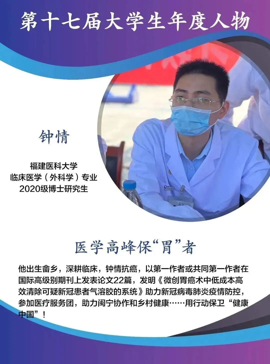 非常荣幸能够获此殊荣,感谢党和国家的培养。在福医求学十一载,感谢福医老师们的谆谆教诲,感谢附属协和医院及导师黄昌明教授、胃外科科室团队给予的培养和支持。